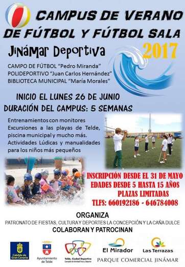 El Campus de Verano Jinámar Deportiva, orientado a niños de edades entre 5 y 15 años, oferta una amplia gama de actividades lúdicas y manualidades, excursiones a las playas de Telde y piscina municipal, charlas sobre nutrición, juegos tradicionales y entrenamiento con monitores, etcétera, actividades que se desarrollarán en las instalaciones del Campo de Fútbol Pedro Miranda, La Biblioteca Pública María Morales y Pabellón Juan Carlos Hernández, que en breve se abrirá al público.
