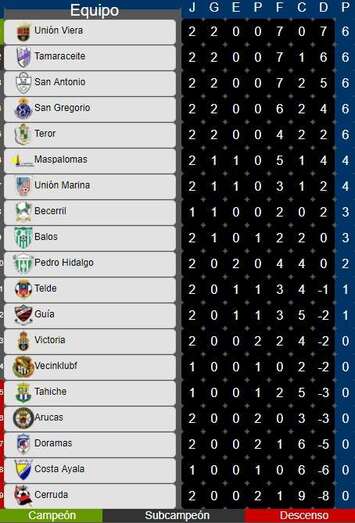 La Unión Deportiva Telde, que comenzó la liga perdiendo en su campo ante el Teror, también logró un empate en el estadio capitalino José Sepúlveda ante el Unión Pedro Hidalgo, merced a un tanto marcado por Roberto. El Telde está en la undécima posición de la tabla, con un punto.