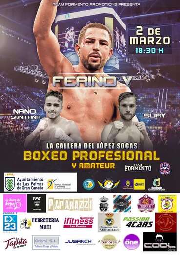 Telde.- El próximo viernes 2 de marzo es la fecha escogida para que el excampeón de Europa, el teldense Ferino V, regrese al ring ante su público tras unos meses de inactividad pugilística. Y será así como combate principal de una velada organizada por Team Formento Promotions en La Gallera del López Socas, donde además le acompañarán en el cartel los boxeadores profesionales Nano "Gallito" Santana y Sury.