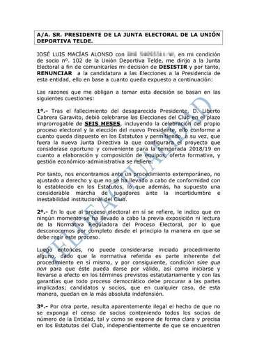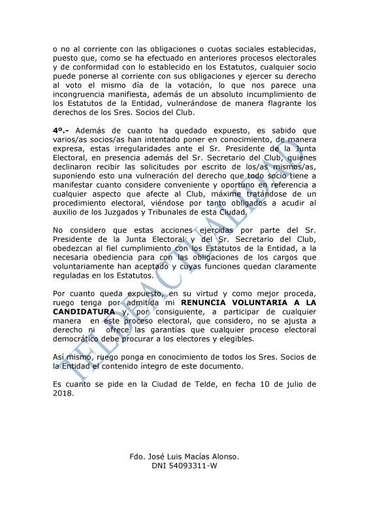 Telde.- José Luis Macías ha presentado su renuncia a candidato a la presidencia de la Unión Deportiva Telde al considerar que el proceso electoral puesto en marcha por la entidad “no se ajusta a derecho ni ofrece las garantías democráticas que se debe procurar a los electores y elegibles”.