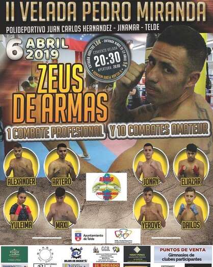 Esta velada, que cuenta con la colaboración de la Concejalía de Deportes del Ayuntamiento de Telde, constará de un combate profesional a seis asaltos entre Zeus de Armas y el sevillano Jesús Ruiz, y diez amateurs de categorías júnior, jóvenes y élite, dos de los cuales estarán protagonizados por féminas.