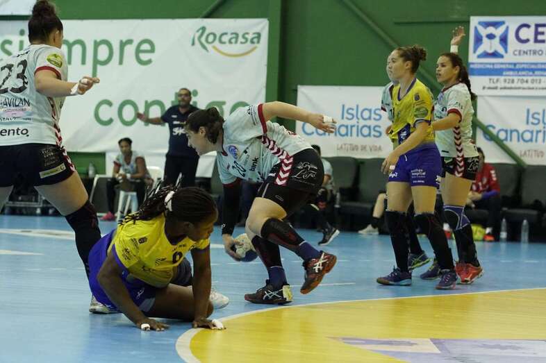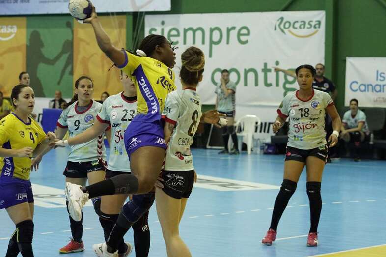 La ventaja duró poco, porque un apretón local con ataques prácticos y rápidos propiciaba un parcial de 5 a 2 para voltear la contienda con un tanto de la extremo zurda, Tiddara Trojaola (6-5). Al paso por el ecuador del primer acto, las fuerzas estaban equilibradas (8-7) con un mejor juego colectivo del equipo canario y el acierto individual de la extremo Aida Palicio (3 goles) en el asturiano.