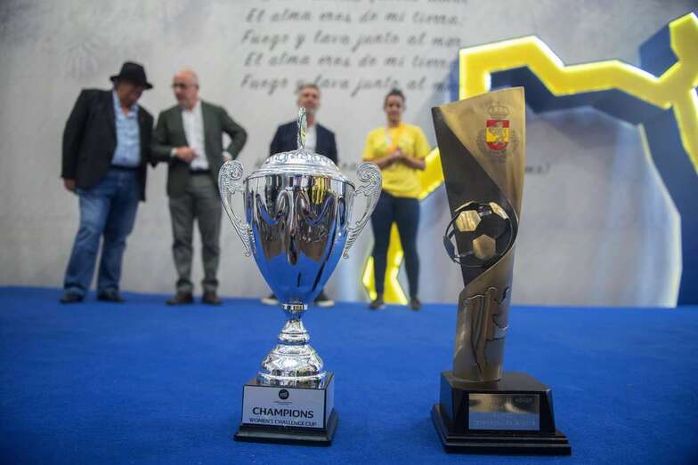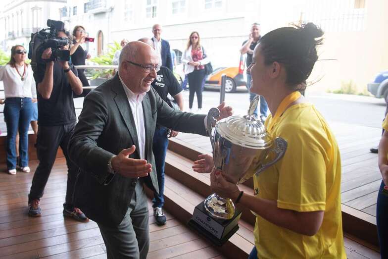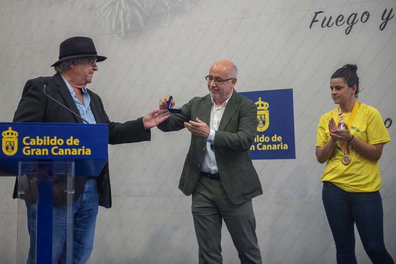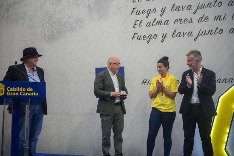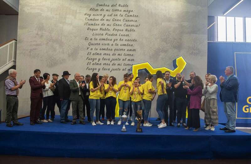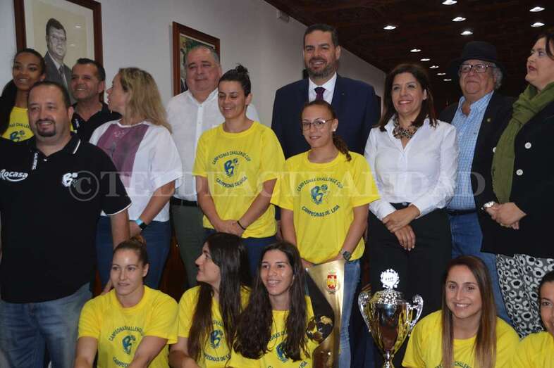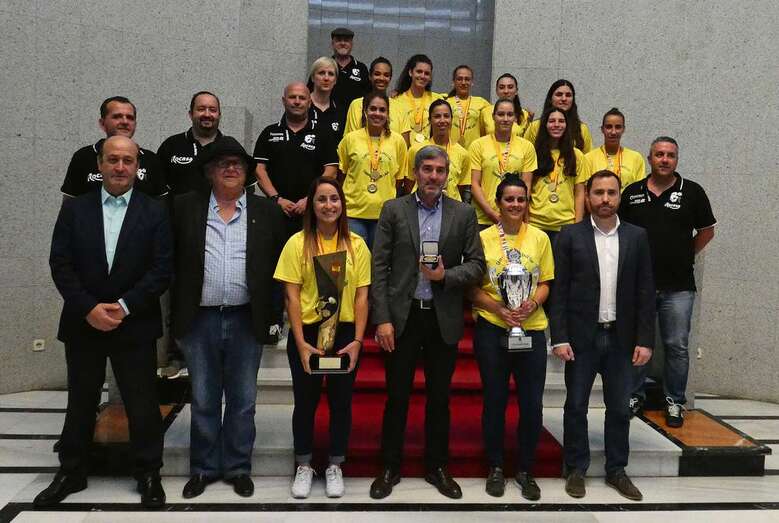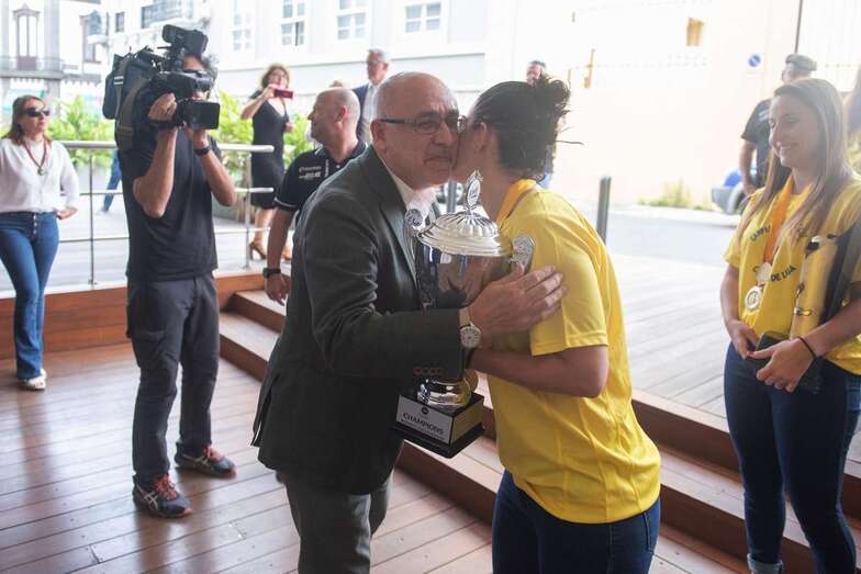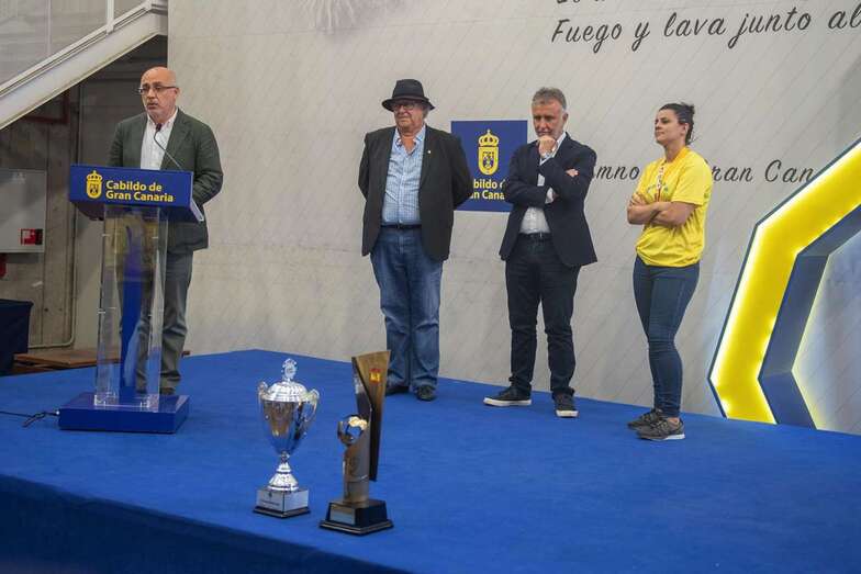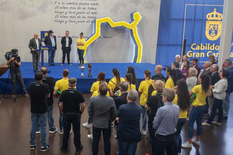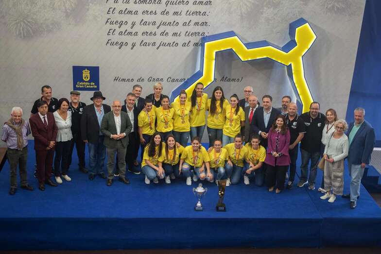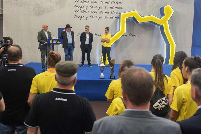 La de este miércoles es una jornada de homenajes para el Rocasa Gran Canaria. Tras el acto en el Ayuntamiento de Telde, la comitiva amarilla partió a la capital grancanaria, a la Casa Palacio insular, donde a las 11.00 horas fue recibida por el presidente Antonio Moreno.