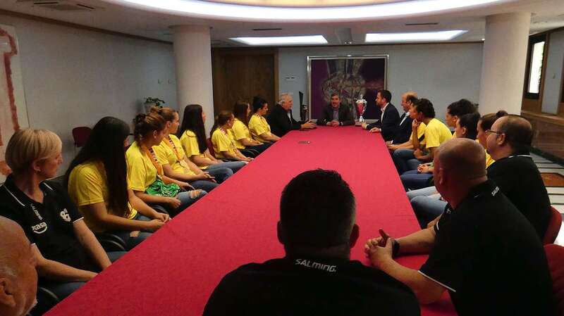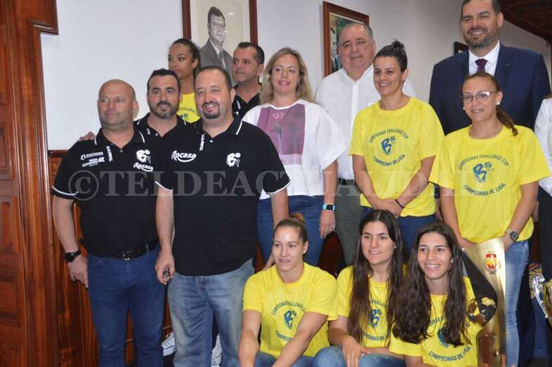 Este miércoles a primera hora, la plantilla y cuerpo técnico visitó las Casas Consistoriales de San Juan. Allí recibieron el reconocimiento de la Corporación local. Con su presidente Antonio Moreno a la cabeza, y con los trofeos de su primera Liga Guerreras Iberdrola y segunda EHF Challenge Cup bajo el brazo, la expedición del Rocasa recibió el reconocimiento del Ayuntamiento y de la ciudadanía teldense.