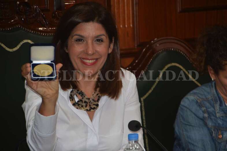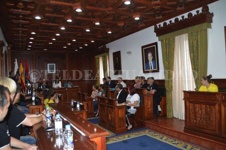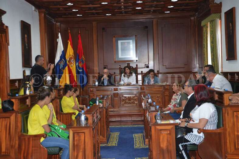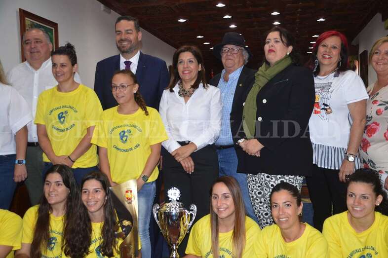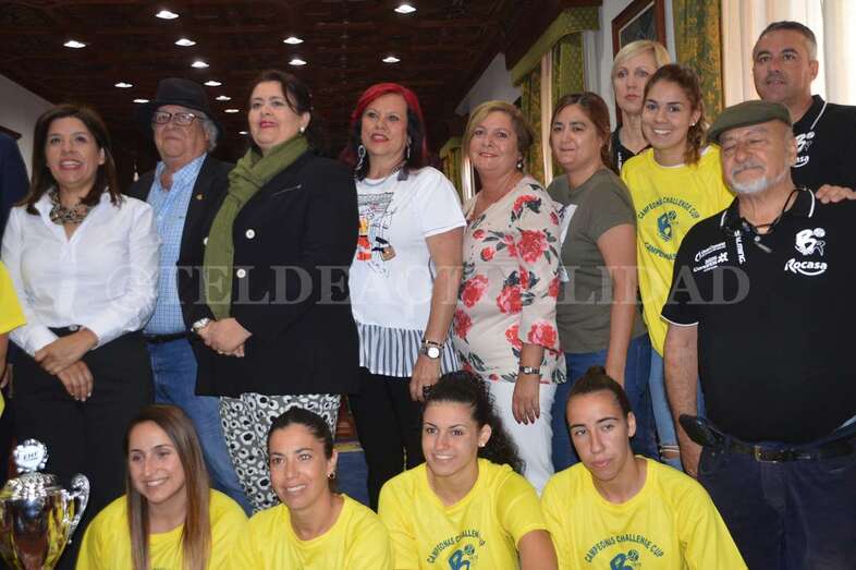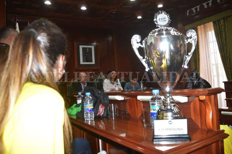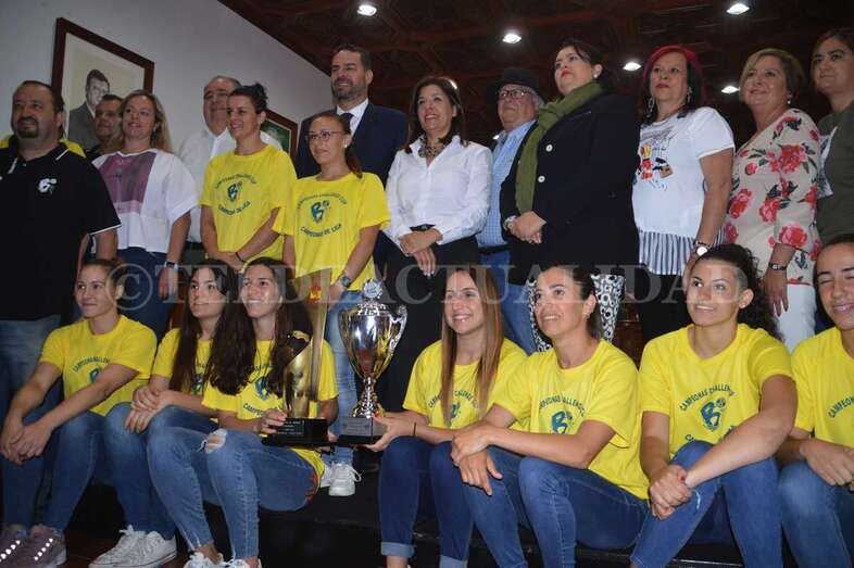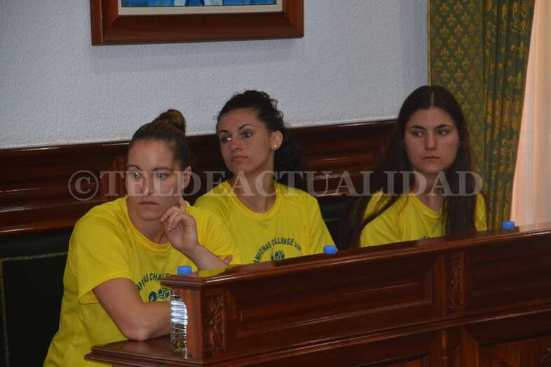 Jugadoras, técnicos y directivos compartieron asiento en el Salón de Plenos con los concejales e inmortalizaron la ocasión posando todos juntos ante las cámaras. La alcaldesa Carmen Hernández pronunció, en nombre de toda la Corporación, unas palabras de felicitación y recibió una réplica de una de las medallas.