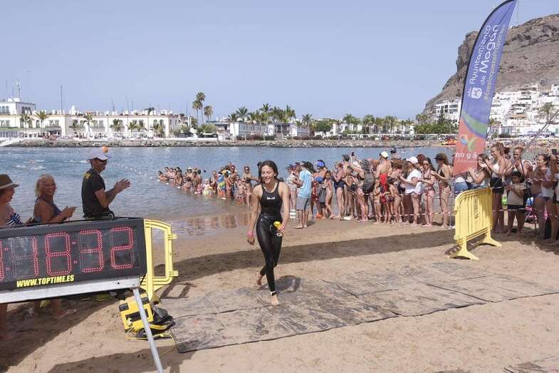 En la categoría femenina, la primera en cruzar llegar a la playa de Mogán fue Carla Chaar del club Aguacan en 15 minutos y 40 segundos. Le siguieron Silvia Blanco (00:17:20) y Judit Padrón de Metropole (00:17:48).
