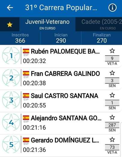 Palome, del equipo 3COM, empleó un tiempo de 20:32 en completar el circuito. Cabrera, del Club Disa HPS Triatlón, llegó seis segundos después. Saúl Castro, también de 3COM,  entró tercero con un crono de 20.55.