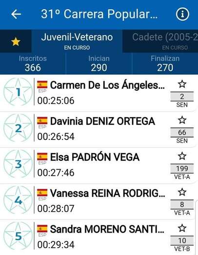 En cuanto a las féminas, la primera Carmen de los Ángeles. Hizo el recorrido en un tiempo de 25:06, seguida de Davinia Déniz Ortega (26:54) y de Elsa Padrón Vega (27:46). La teldense Sandra Moreno fue quinta de la general femenina (29:34).