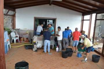 La vendimia arrojó como resultado la recogida de unos 1.300 kilos de uva blanca en sus variedades de listán, malvasía y moscatel, y alrededor de 3.800 kilos de uva negra (tintilla, negramoll y listán).
