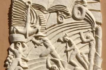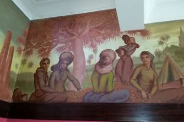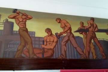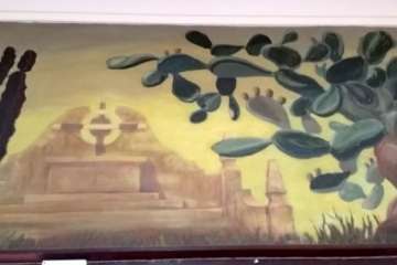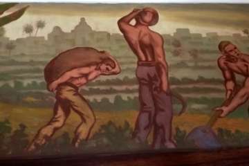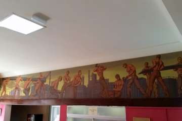 Allí dejo a mis espaldas la reja que franquea las puertas de la Secretaría y acceso a las aulas, el salón queda con los ecos apagados por el silencio del tiempo. Un cartel me indica el edificio construido en 1961. El bello friso que el pintor José Arencibia Gil dibujó y pintó para ilustrar artísticamente este centro, como un libro abierto, lectura de aquel mundo agrario, y en sus inicios industriales, un homenaje a la mujer y hombre que sobre la tierra ejercían sus labores y quizás no pudieron disponer de un tractor como aquel que los alumnos del Instituto Laboral pudimos manejar en el Campo de Prácticas de Jerez.