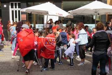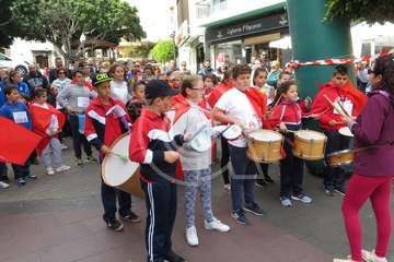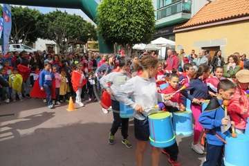 A modo de calentamiento general, los alumnos hicieron un recorrido por el circuito acompañado por una batucada escolar dirigida por la profesora Carmen Aceytuno y bailaron al son de la pegadiza canción Pa’ fuera. Luego tuvieron lugar las carreras por ciclos por un circuito de 100 metros de longitud en las que muchos pequeños participaron acompañados de sus padres y profesores.