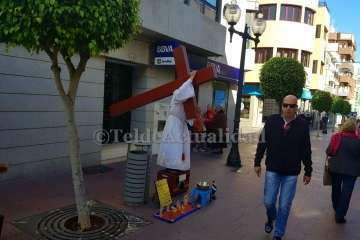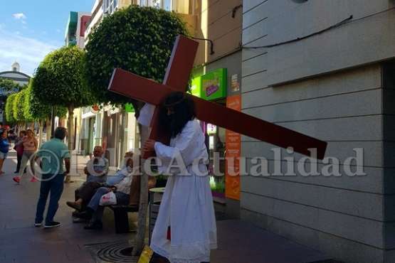 Se trata de una perfomance de un nombre vestido con una túnica blanca, barba poblada y larga cabellera que subido a una pequeña tarima porta a cuesta una cruz asemejando a Jesucristo de Nazaret. Ha sido el atractivo de esta mañana en la calle peatonal principal de Los Llanos.