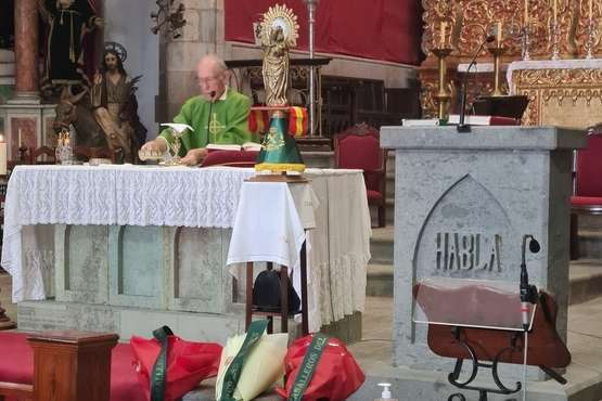 Por la tarde, a partir de las 18.00 horas, se celebró una misa oficiada por el párroco de la zona José María Cabrera, titular de San Juan Bautista, y a su finalización tuvo lugar la procesión religiosa por las calles de las imágenes de la patrona y de Cristo Crucificado con el acompañamiento de fieles, Banda Municipal y autoridades.