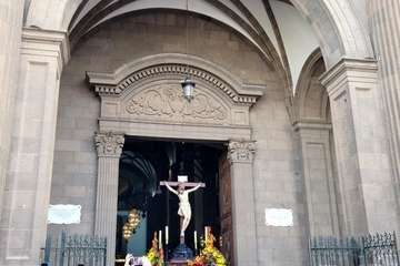 El desfile religioso de sólo cuatro de los ochos pasos, al igual que en la edición anterior, salía por puerta principal de la Basílica de San Juan al filo de 19.45 horas, tras los santos oficios celebrados en su interior y presididos por el párroco José María Cabrera.