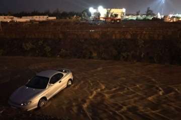 Unos 40 coches aparcados junto al aeropuerto pueden ser arrastrados por las fuertes lluvias e incluso corren el peligro de terminar en el mar en el sureste de Gran Canaria.