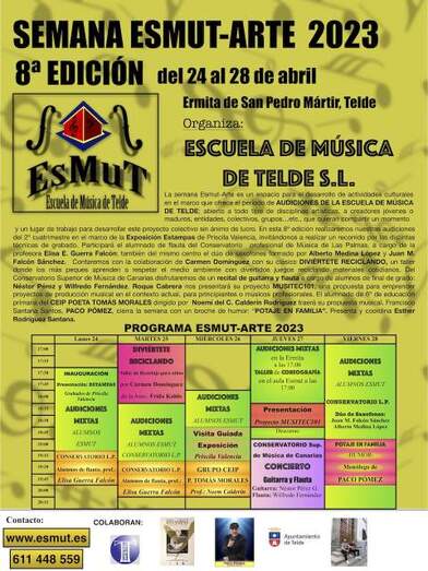 La Escuela de Música de Telde (Esmut) celebra del 24 al 28 de abril la octava edición de su evento EsmutArte, un espacio abierto a todo tipo de disciplinas artísticas que se desarrolla en la Ermita de San Pedro Mártir junto a las audiciones de la propia entidad.