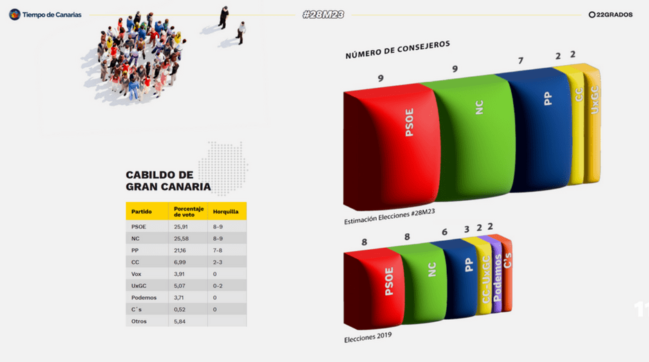 La diferencia con respecto a 2019 es la pérdida de uno de los cuatro ediles de CC ante el tirón de un Partido Popular (PP) que recupera terreno tras el descalabro que sufrió en las dos últimas elecciones. Después de gobernar durante los mandatos 2003- 2007 (el denominado trienio negro, marcado por el caso Faycan de corrupción) y 2011-2015, la formación conservadora quedó relegada a quinta fuerza con apenas tres concejales en 2015 y dos en 2019. El sondeo le da ahora más del doble de votos que en esos últimos comicios y entre cuatro y cinco ediles.