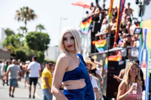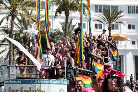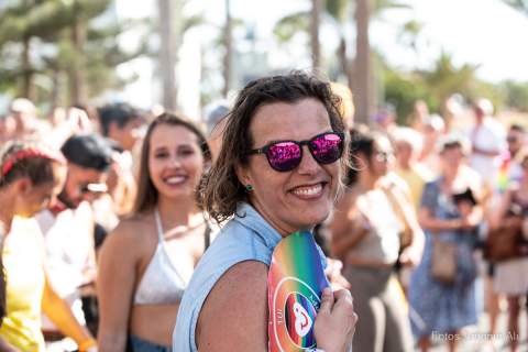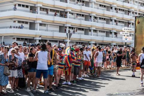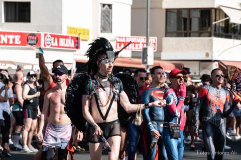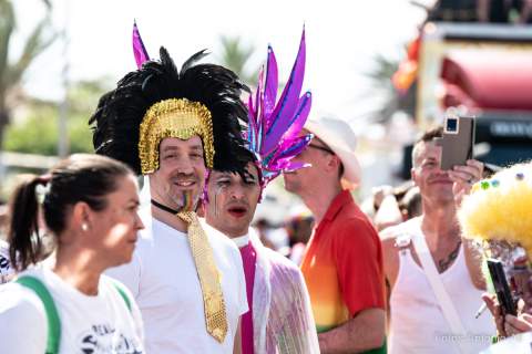 Por las calles de Maspalomas desfilaron miles de personas de varias nacionalidades, que lucieron con orgullo los colores del arcoíris, el emblema creado por Gilbert Baker para defender la tolerancia, en las banderas, gorras, bañadores y zapatos, además de cientos de banderas que ondeaban en los balcones de hoteles y apartamentos, durante todo el recorrido de la marcha.