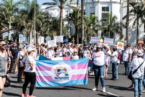 Con una temperatura de 27 grados, la travesía multicolor arrancó a las 17.10 horas, encabezada un año más por padres, madres y jóvenes de la Asociación Crysallis Canarias portando banderas, gorras y camisetas con el lema ‘No es mi cuerpo es tu mirada’, para reivindicar el respeto a la Diversidad y la identidad sexual de los jóvenes.