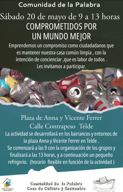 El Ayuntamiento de Telde colabora con la asociación Comunidad de la Palabra en una limpieza medioambiental que tendrá lugar este sábado, de 9.00 a 13.00 horas, en el entorno de la plaza Anna y Vicente Ferrer, en El Contrapeso.