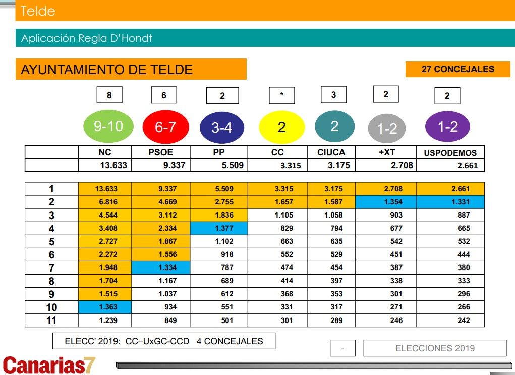 El resto de la corporación quedaría integrada por Coalición Canaria, con 2 ediles y unos 3.300 votos. CC se presentó en 2019 junto a Unidos por Gran Canaria y CCD, cosechando entonces 4 concejales.