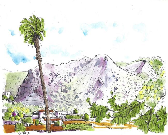 En dirección norte observo la potente ladera de solana del barranco de San Miguel -y las urbanizaciones que lo coronan-, la curva producida al unirse al barranco de los Cernícalos para formar uno de los ramales principales del barranco Real. Abajo, en su cauce, un mar de cultivos bajo plástico definen una de las zonas agrícolas más productivas de Valsequillo. Elevando la vista en esta dirección nos encontramos con la montaña de Tafira y el pico de Bandama.