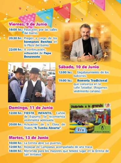 El barrio de San Antonio se prepara para vivir sus fiestas patronales. Festejos que arrancarán este viernes, 9 de junio, con el pregón a cargo de los hermanos Benítez y el concierto de Pepe Benavente y que se extenderán hasta el día 18 de junio.