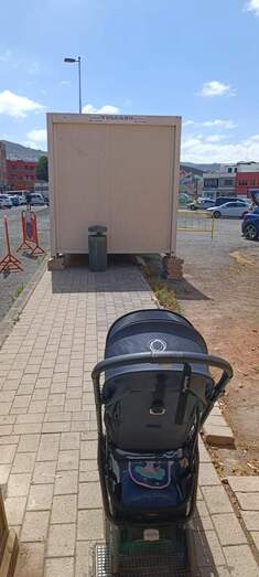 Buenas tardes. Envío esta foto de esta tarde en la zona donde se está construyendo el parking modular nuevo al lado de los colegios de San Juan. Han puesto la caseta de la obra justo en la acera, interrumpiendo el paso a personas con carros o personas con movilidad reducida... Sobre todo, teniendo espacio más que suficiente a la derecha en el mismo parking.