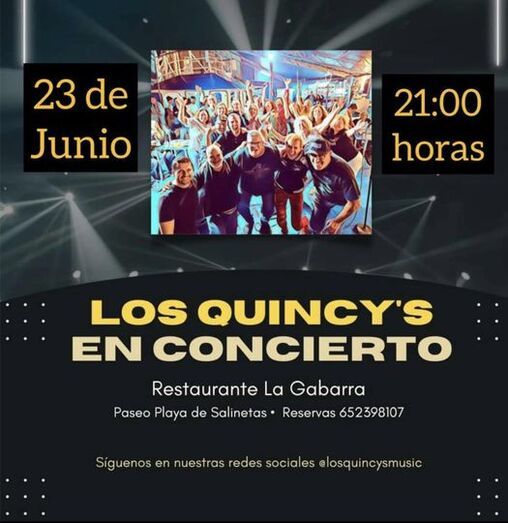 El conocido restaurante  La Gabarra, de Salinetas, ha organizada para la Noche de San Juan un concierto de la banda grancanaria Los Quincys, un grupo de Funk/Rock/Pop para todos los gustos integrado por cinco mimebros: batería, guitarra, bajo, teclados y voz.