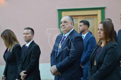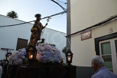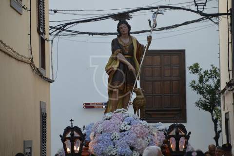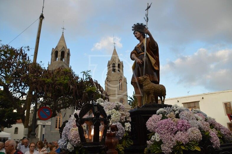 Luciendo una preciosa composición de flor de mundo, obra del artista y diseñador Segundo Amador, el trono de San Juan Bautista, patrono de la ciudad, recorrió esta noche las calles del casco histórico de Telde con el acompañamiento de un nutrido grupo de feligreses, Banda Municipal de Música y autoridades encabezadas por el nuevo alcalde Juan Antonio  Peña (Ciuca).