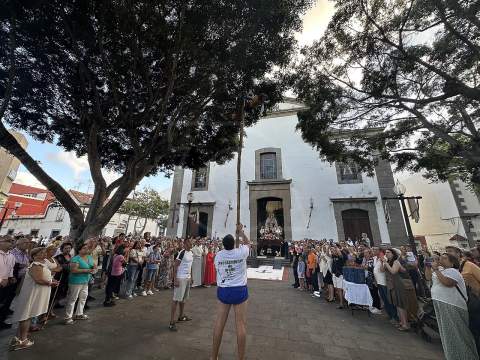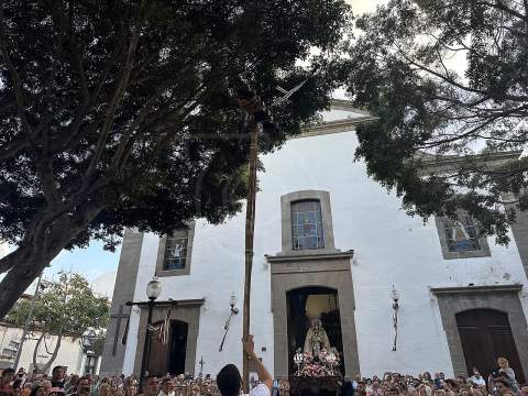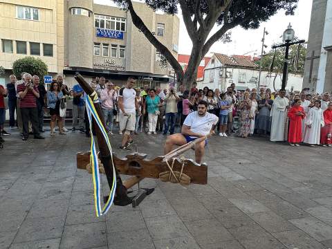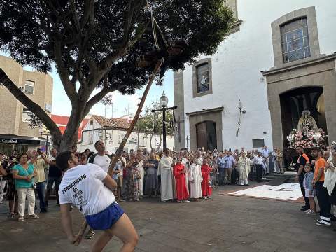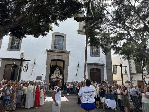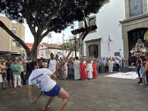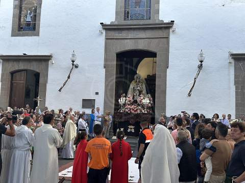 Una alfombra de sal neutra y teñida que delineaba un ancla, confeccionada por un grupo de personas dirigido por el joven Fernando Martín, recibió a la patrona de los marineros a su salida del templo neoclásico, a la que también se le mostró una exhibición del levantamiento del arado por descendientes del legendario Joé Rodríguez Franco (1912-1991), conocido por el Faro de Maspalomas.
