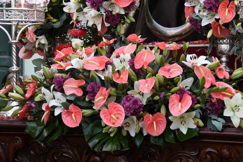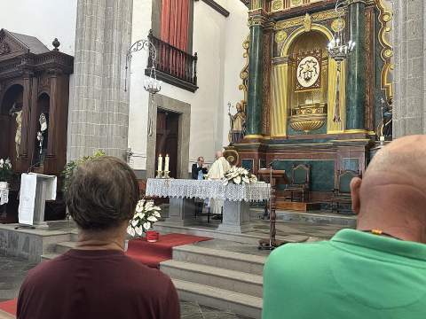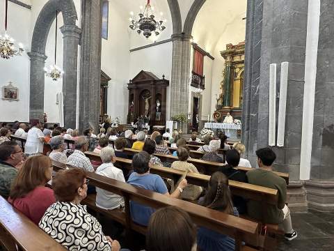 El trono de la virgen lucía un bello ornato floral, una composición del artista teldense Segundo Amador que combinaba diferentes plantas como lilios, anturios, crisantemos y eucaliptos.