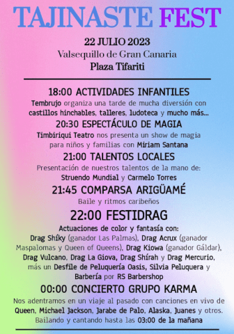Una noche en la que estará presente la comparsa Arimagüe que llenará el municipio de ritmos y bailes caribeños, como antesala, del FestiDrag. Un acto que congrega al mejor talento del Arte Drag de la isla que pretende visibilizar la escena de artistas de performances drag en el municipio. Lo mejor de lo mejor se dará cita esa noche en Valsequillo donde se contará con Drag Shíky, ganador de la Gala Drag Queen del Carnaval de Las Palmas de Gran Canaria 2023, Drag Acrux, Queen of Queens del Gáldar Pride 2023 y Drag Kiowa, Drag Queen del Carnaval de Gáldar 2023. A ellos se sumarán el Drag Vulcano, Drag La Giova, Drag Shírah y Drag Mercurio. Un espectáculo al que este año además participarán varias empresas dedicadas a la peluquería y estética de la localidad que realizarán un desfile. La Peluquería Oasis, Silvia Peluquera y la Barbería RS Barbeshop. Una noche que terminará con el concierto del grupo Karma.