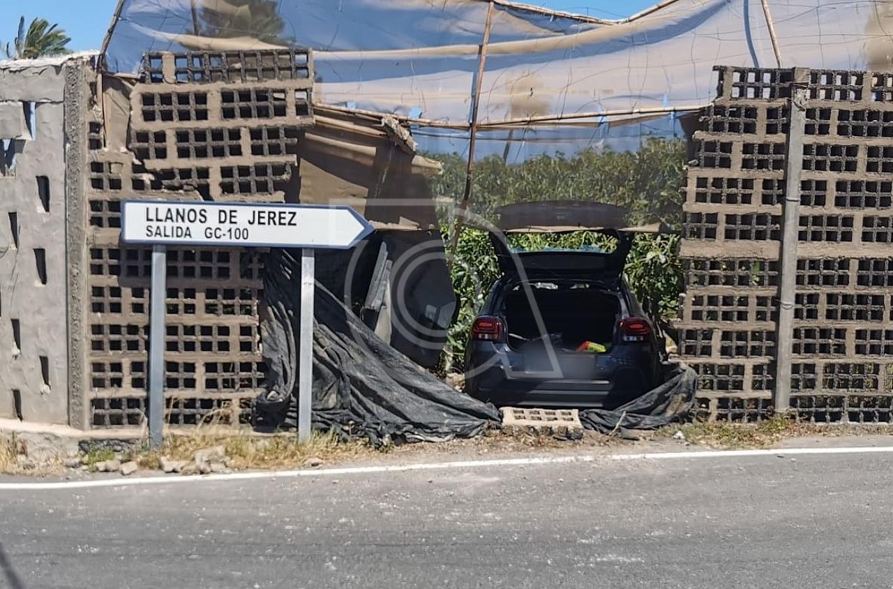 Un vehículo destrozó este lunes un antiguo muro de una finca en la zona de los Llanos de Jerez tras impactar contra él.