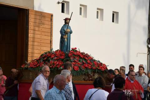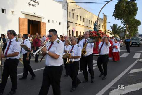 Tras la eucaristía que contó con el acompañamiento de la Parranda El Vino (19.00 horas), los tronos de los patronos salieron a hombros de feligreses en su periplo por las principales calles de Lomo Cementerio, acompañados de la Banda Municipal de Música de la ciudad.