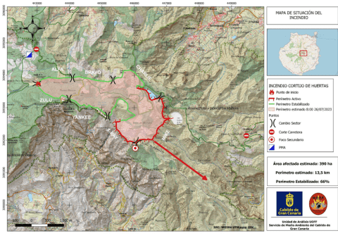 El flanco izquierdo, que afectada a la zona de Cuevas Blancas y el Roque Saucillo, está controlado al 100%, incluso liquidado en algunos puntos (sin humo). El flanco derecho, que es el más próximo a los Riscos de Tirajana, tiene activo apenas un 5%, y  la cabeza del incendio, situada al borde de La Caldera de Los Marteles, tiene también apenas un 5% activo y fraccionada en diversos puntos calientes.