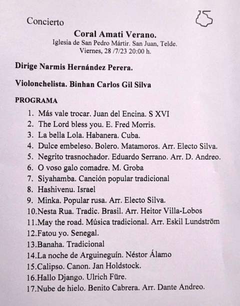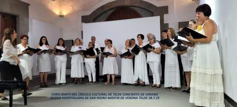 Bajo las bellas bóvedas artesonadas de la histórica y patrimonial iglesia hospitalaria de San Pedro Mártir de Verona, el Coro Amati del Círculo Cultural de Telde, la noche del viernes 28 de julio ofreció su concierto de verano dirigido por la profesora Narmis Hernández Perera, en un diverso y atractivo programa de composiciones, arreglos y adaptaciones músico vocales de brillante ejecución interpretativa de ritmos, tonos y registros de voces logrados por esta agrupación coral desde su fundación en 2011, ante un público asistente que llenó el emblemático recinto, que por su calidad y destacadas dotes interpretativas corales cada composición de las 17 que integraban el programa entregado para su seguimiento, fue largamente aplaudida y ovacionada.