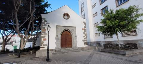 Edificación unida al patio del antiguo hospital por una puerta gótica que se abre en uno de los laterales, su fachada principal daba a una plazoleta orientada a poniente, posteriormente al imponerse el tránsito por la Calle Real, hoy Juan Carlos I, se traslada la puerta principal de acceso al naciente quedando la capilla en sentido inverso a su origen. Durante un largo período prestó servicios al centro de beneficencia pública hospital que protegiera con sus desvelos, piedad y generosidad, Inés Chemida o Chimida, hija de nativa canaria y de soldado portugués. Iglesia en la que se oficia misa hasta 1846 y en agosto de 1899 sufre un derrumbe. Las obras recientes de reconstrucción le devuelven sus líneas arquitectónicas gracias al proyecto del arquitecto Salvador Fábregas.