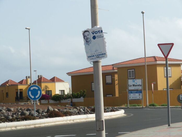 Un  desteñido cartel de Unidos por Gran Canaria, con foto de su líder local, Carlos Carreño, sigue pidiendo el voto a los teldenses 70 días después de celebrarse los comicios municipales del 28M. El anuncio electoral está en una luminaria del vial costero próxima a la rotonda de acceso a la urbanización de Hoya de Pozuelo.