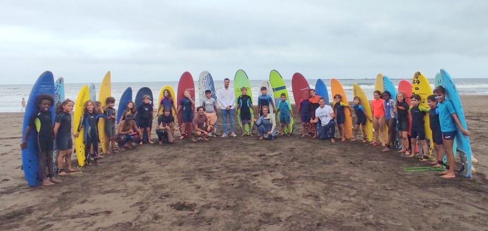 El concejal de Actividad Física y Deportes del Ayuntamiento de Telde, Cristhian Santana Caballero, visitaba a los técnicos y cerca de 20 pequeños participantes de una de las actividades más esperadas del verano como son los Cursos de Surf.