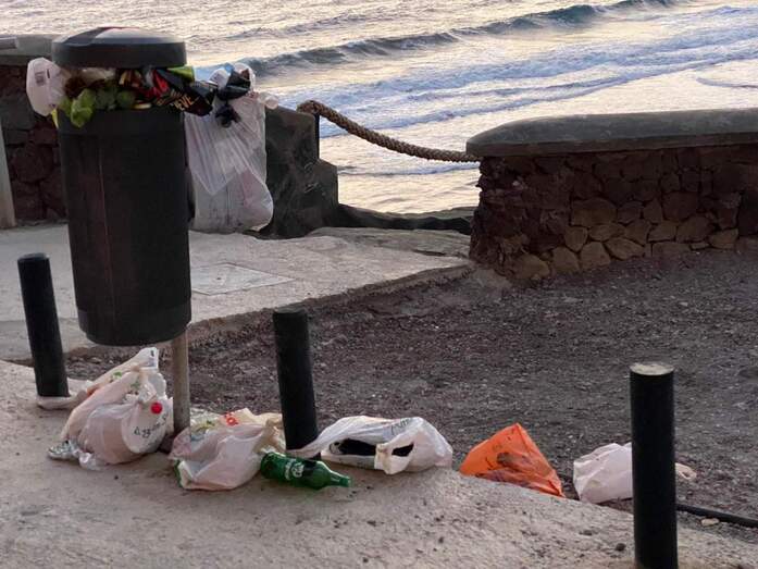 Usuarios y vecinos de La Garita denuncian la acumulación de bolsas repletas de basura en el entorno de la papelera que está en la bajada de la cala de Palos desde la calle de Madreselva, una situación que se da todos los fines de semana sin que nadie aporte una solución.