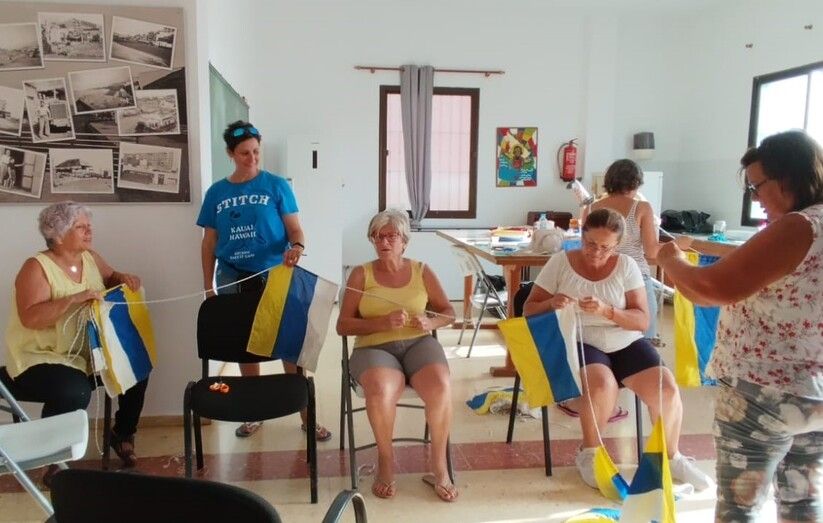 Vecinos de Melenara preparan la decoración del barrio para sus fiestas, en honor del Santo Cura de Ars y de la Virgen del Carmen, que arrancan este viernes con el pregón de Jorge Santana. Y para ello orearon este jueves las banderas que se colocarán en las calles de este enclave costero.