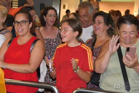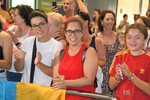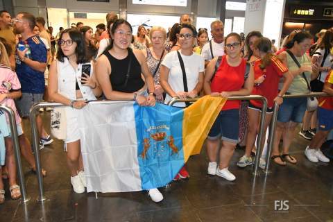 Decenas de personas esperaban a la salida de pasajeros del Aeropuerto de Gran Canaria para recibir entre aplausos y vítores a la teldense Misa Rodríguez, campeona del mundo con la Selección Española femenina de fútbol. Acudió también el alcalde del municipio, Juan Antonio Peña, junto a otros miembros de la Corporación municipal, que agasajaron a la jugadora con palabras de orgullo por el logro conseguido. TA ofrece una galería de imágenes del recibimiento.