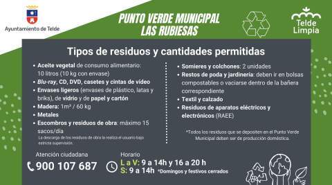 En esta línea, cabe recordar que dicho punto verde, ubicado en la calle Monseñor Óscar Romero, número 51 -del polígono industrial de Las Rubiesas-, está operativo de lunes a viernes de 9.00 a 14.00 y de 16.00 a 20.00 horas, mientras que los sábados está abierto en horario de mañana.