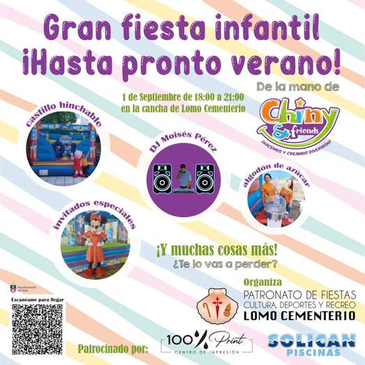 Todas aquellas familias que quieran vivir un viernes diferente, antes de comenzar de nuevo con la rutina, donde la diversión y el entretenimiento están garantizados, solo tienen que acercarse a Lomo Cementerio y disfrutar de esta primera fiesta celebrada por el recién estrenado patronato, bajo la presidencia de Janira Quesada, para decir “hasta pronto” al verano.