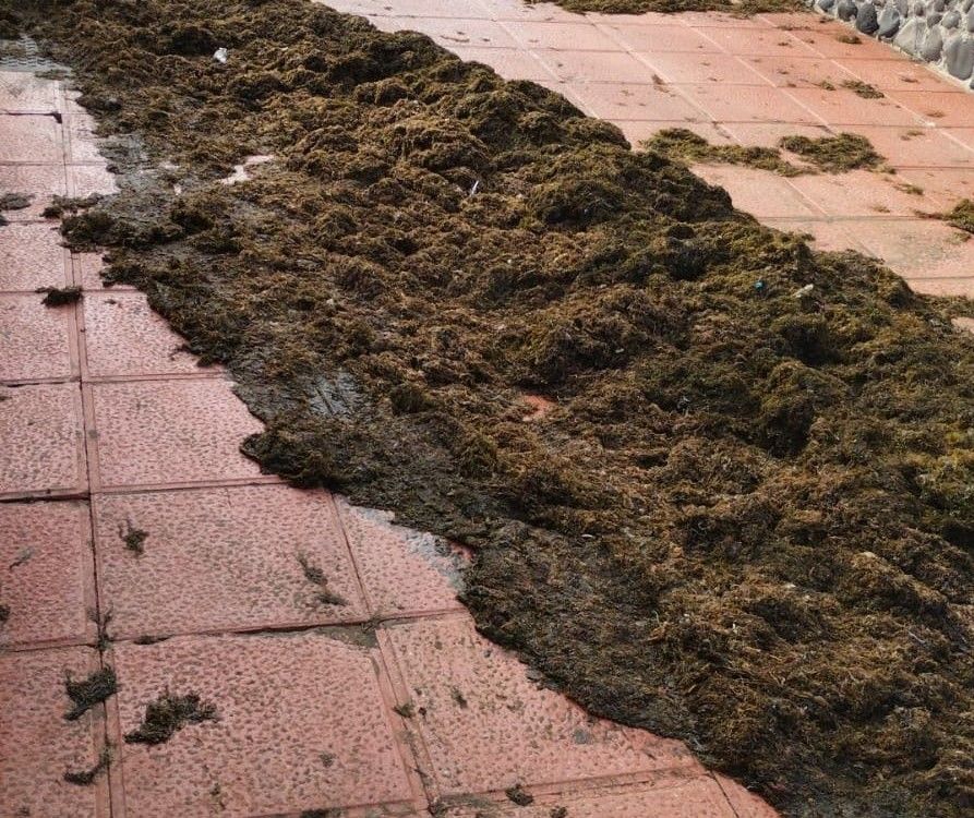 El servicio de limpieza del Ayuntamiento de Telde ha retirado este martes gran cantidad de algas acumuladas en la playa de Ojos de Garza.