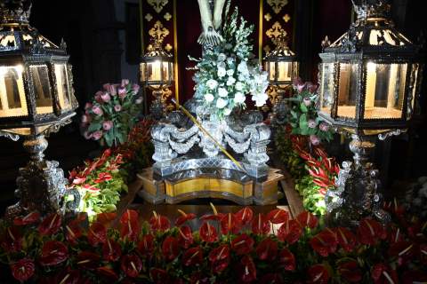 Como novedad este año, la piadosa imagen en sus pies se paseará por San Juan acompañada por el bastón de mando de la ciudad de Telde, por dos motivos, ya que el Santo Cristo es alcalde perpetuo de la ciudad y, este 2023, el templo matriz cumple 50 años de proclamación de Basílica Menor. La imagen irá engalanada con un diseño floral que anoche, de madrugada, confeccionaba Segundo Amador a base de anthurium rojos combinados con proteas y hojas de eucaliptus.