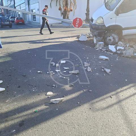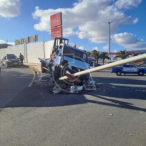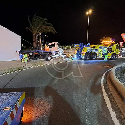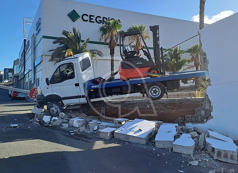 Un camión grúa que portaba una carretilla se empotró contra un muro en la vía de salida de la calle de Los Peregrinos hacia de Prior Mateo Tello, en el Parque Empresarial de El Goro.