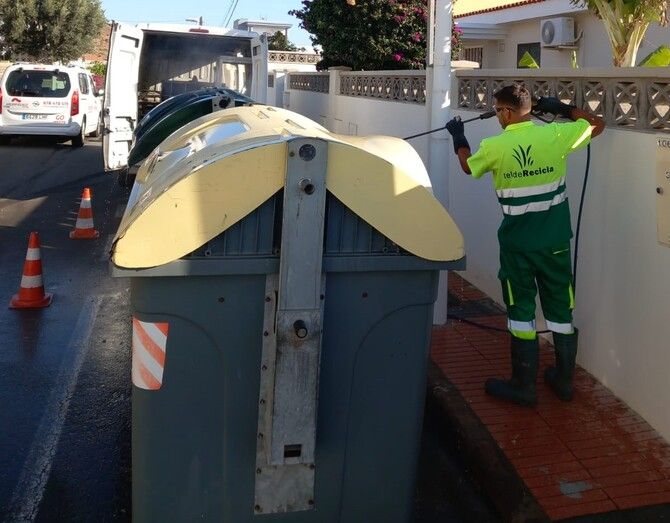 En San Antonio en la Urbanización Rodríguez también han limpiado a fondo los contenedores, la verdad que hacía mucho tiempo que no se veía a los operarios