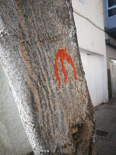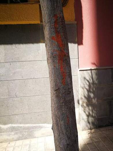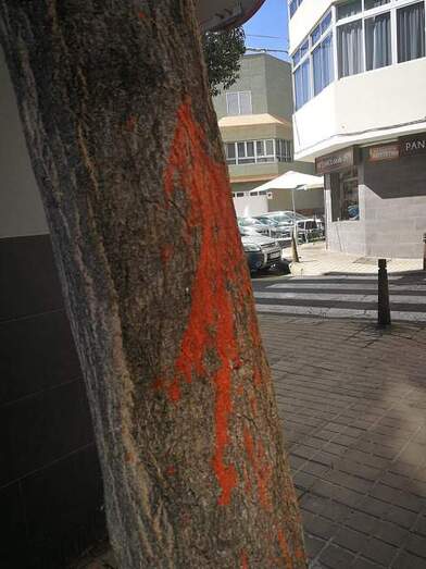 En los últimos días, en las calles La Pinta y Cristóbal Colón, han aparecido en algunos árboles un poco resecos ( no he visto nunca regarlos,) y otros aún florecientes, unas marcas con pintura roja, señal de que los van a talar o algo similar.